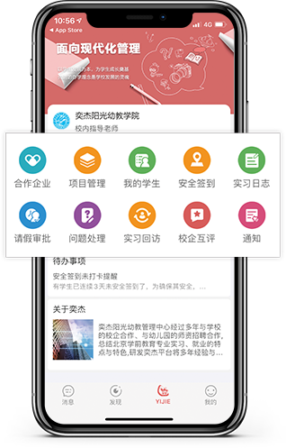 “奕杰阳光”移动平台采用移动互联应用、多方共享的先进理念,提供专业化实习管理工具。